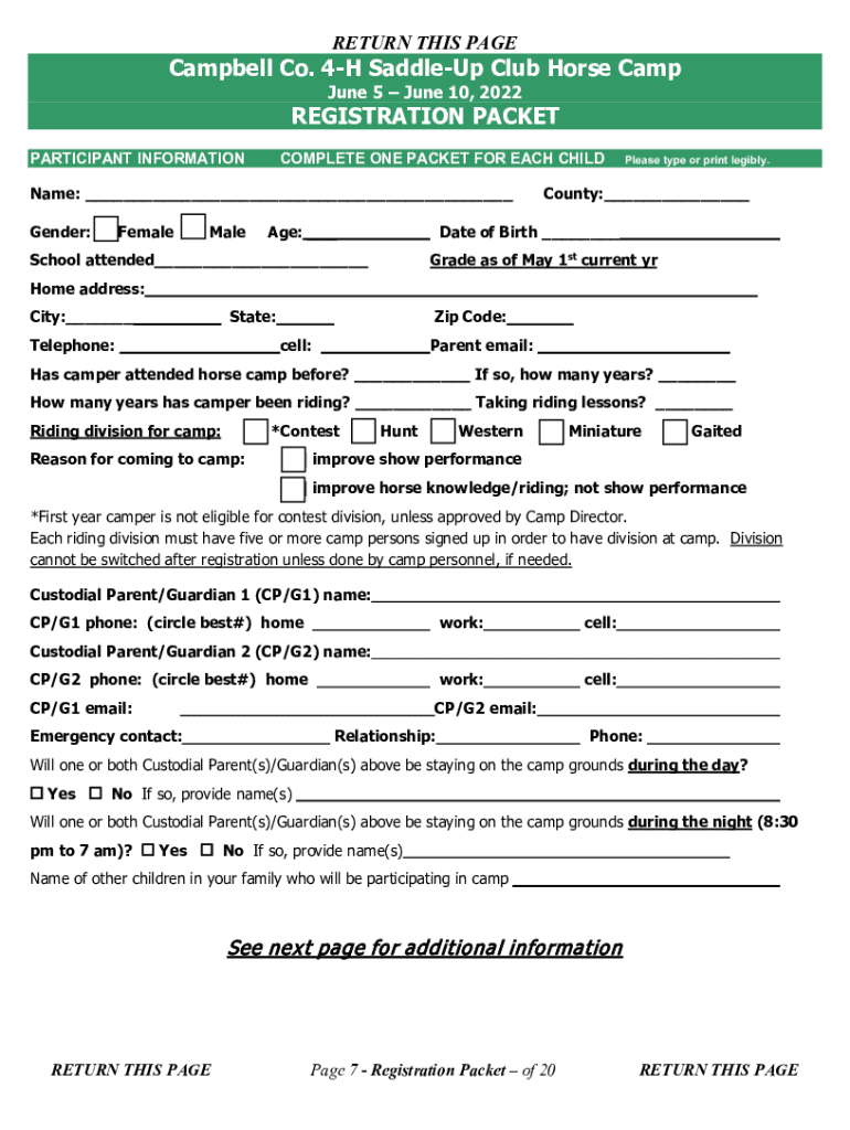 KEEP THIS PAGE Campbell Co. 4H Saddle Club Horse Camp June 5 June 10, 2022, HORSE CAMP INFORMATION KEEP FOR REFERENCE Camp location: Alexandria Fairgrounds, 100 Fairgrounds Road, Alexandria, KY Open