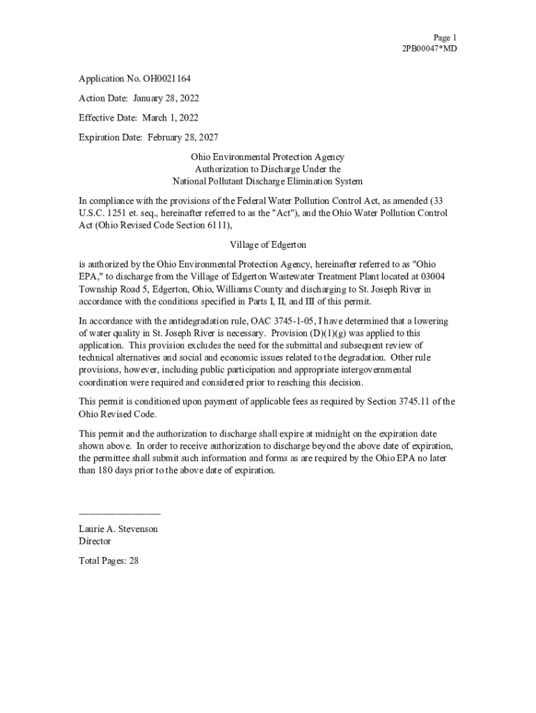 Page 1 2PB00047×Application No. OH0021164 Action Date: January 28, 2022, Effective Date: March 1, 2022, Expiration Date: February 28, 2027 Ohio Environmental Protection Agency Authorization to Discharge
