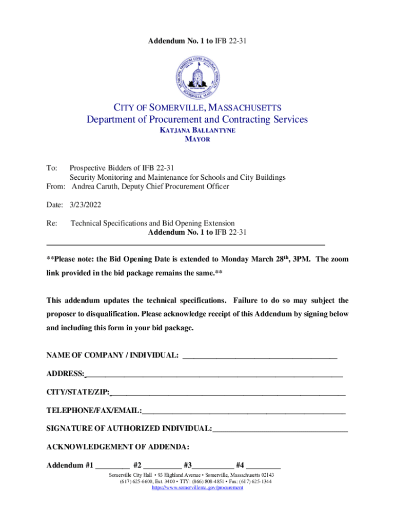 Addendum No. 1 to IF 2231CITY OF SOMERVILLE, MASSACHUSETTS Department of Procurement and Contracting Services KATRINA BALLANTYNE Mayor:Prospective Bidders of IF 2231 Security Monitoring and Maintenance