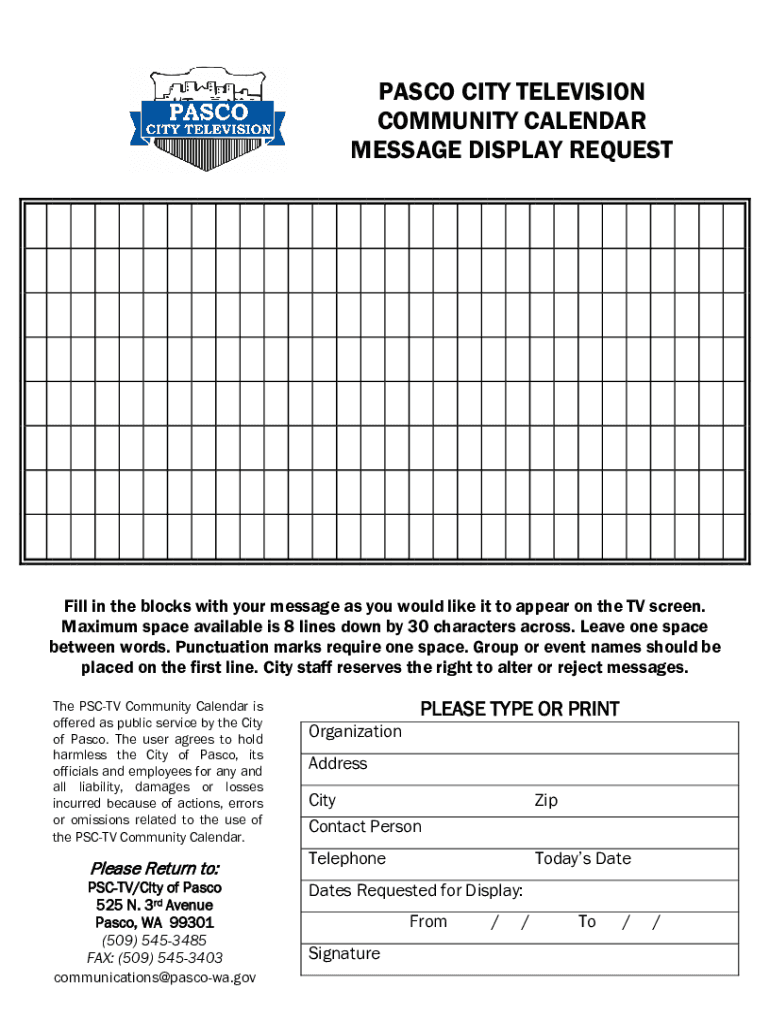 PASCO CITY TELEVISION COMMUNITY CALENDAR MESSAGE DISPLAY Requesting in the blocks with your message as you would like it to appear on the TV screen. Maximum space available is 8 lines down by 30 characters