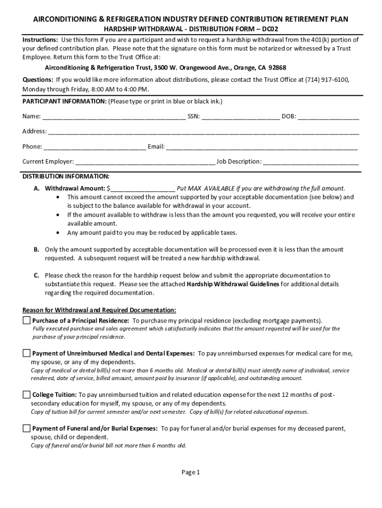 3500 W. ORANGEWOOD AVE., ORANGE, CA 92868 PHONE: (714) 9176100 FAX: (714) 9176065Important Notice regarding the Air conditioning and Refrigeration Industry Defined Contribution Retirement Plan Hardship