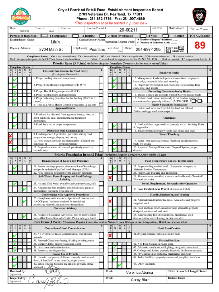 City of Pearland Retail Food Establishment Inspection Report 2703 Veterans Dr. Pearland, TX 77581 Phone: 281.652.1766 Fax: 281.997.4660 *This inspection shall be posted in public view Date:08/25/21Time