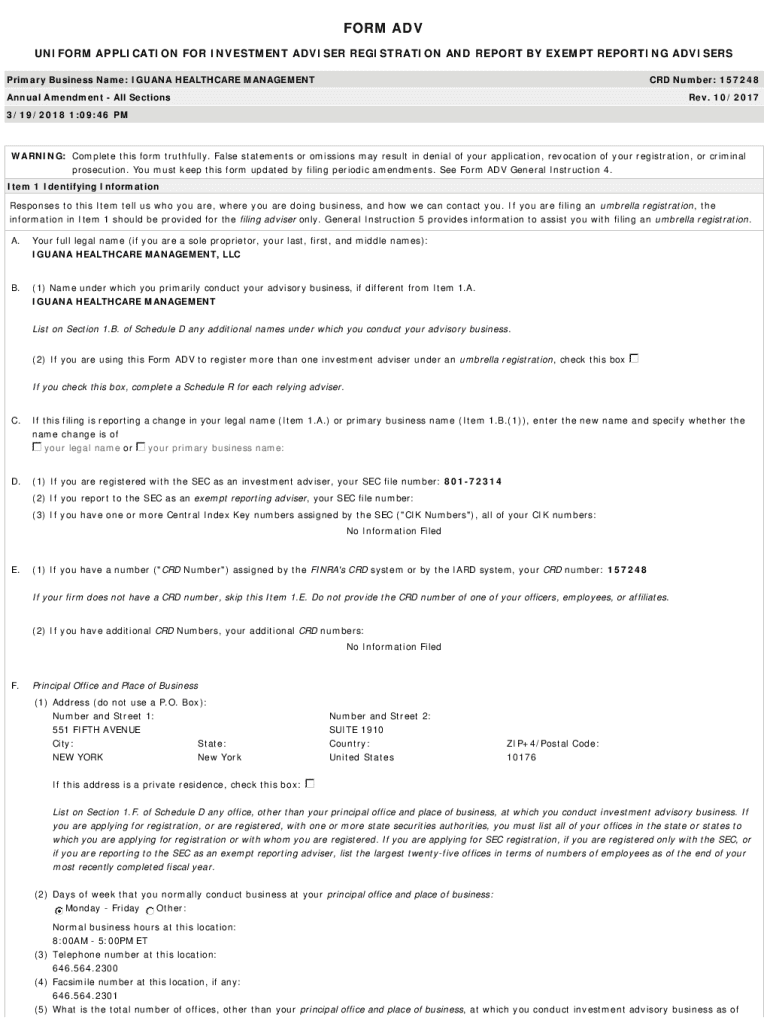 FORM ADV UNIFORM APPLICATION FOR INVESTMENT ADVISER REGISTRATION AND REPORT BY EXEMPT REPORTING ADVISERS Primary Business Name: IGUANA HEALTHCARE MANAGEMENT CRD Number: 157248Annual Amendment All