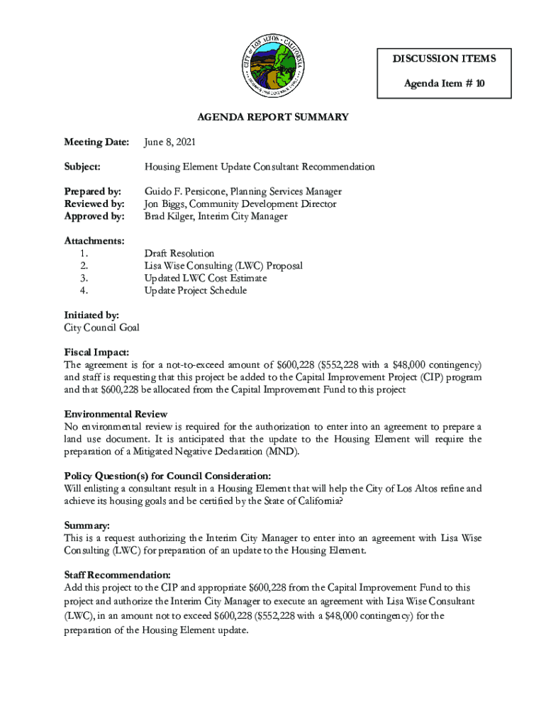 DISCUSSION ITEMS Agenda Item # 10 AGENDA REPORT SUMMARY Meeting Date:June 8, 2021Subject:Housing Element Update Consultant RecommendationPrepared by: Reviewed by: Approved by:Guido F. Periscope, Planning