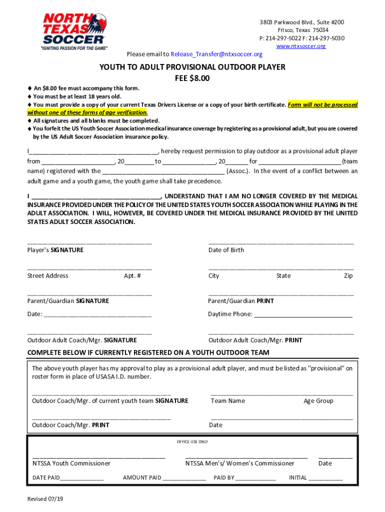 3803 Park wood Blvd., Suite #200 Frisco, Texas 75034 P: 2142975022 F: 2142975030 www.ntxsoccer.orgPlease email to Release_Transfer@ntxsoccer.orgYOUTH TO ADULT PROVISIONAL OUTDOOR PLAYER FEE $8.00