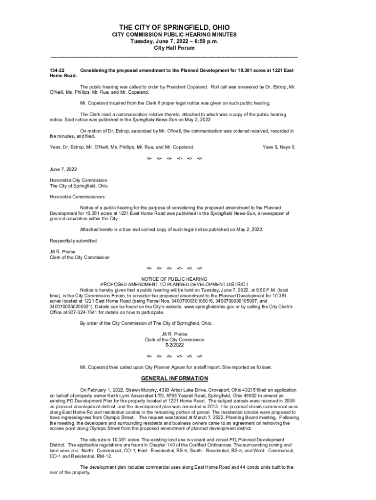 THE CITY OF SPRINGFIELD, OHIO CITY COMMISSION PUBLIC HEARING MINUTES Tuesday, June 7, 2022 6:50 p.m. City Hall Forum ___ 13422 Considering the proposed amendment to the Planned Development for 10.381