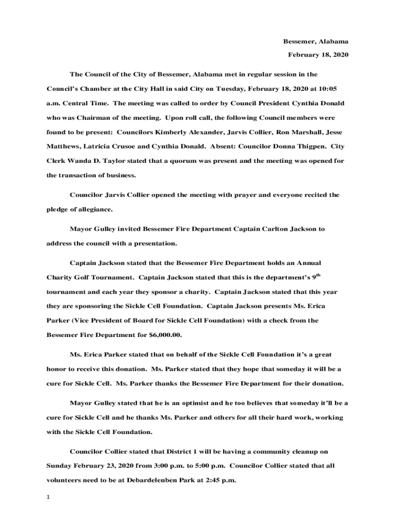 Bessemer, Alabama February 18, 2020, The Council of the City of Bessemer, Alabama met in regular session in the Councils Chamber at the City Hall in said City on Tuesday, February 18, 2020, at 10:05