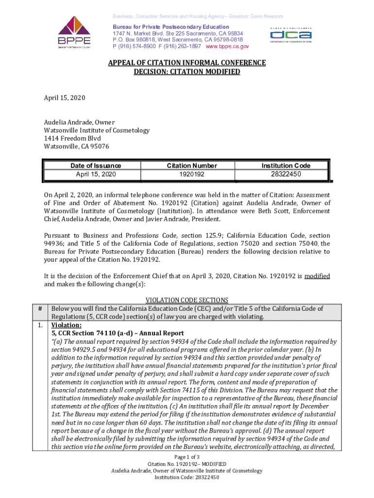 Get the free Bureau for Private Postsecondary Education - Watsonville Institute of Cosmetology -M...