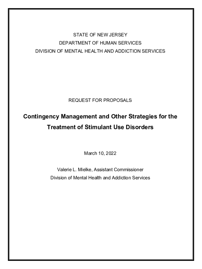 STATE OF NEW JERSEY DEPARTMENT OF HUMAN SERVICES DIVISION OF MENTAL HEALTH AND ADDICTION SERVICESREQUEST FOR PROPOSALSContingency Management and Other Strategies for the Treatment of Stimulant Use