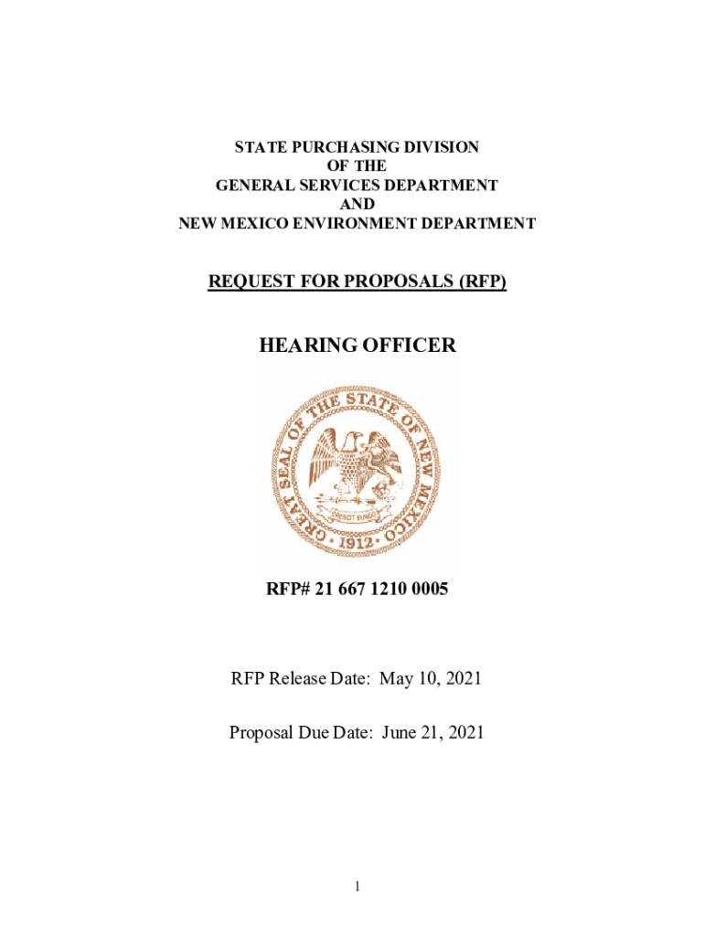 STATE PURCHASING DIVISION OF THE GENERAL SERVICES DEPARTMENT AND NEW MEXICO ENVIRONMENT DEPARTMENTREQUEST FOR PROPOSALS (RFP)HEARING OFFICER RFP# 21 667 1210 0005RFP Release Date: May 10, 2021, Proposal
