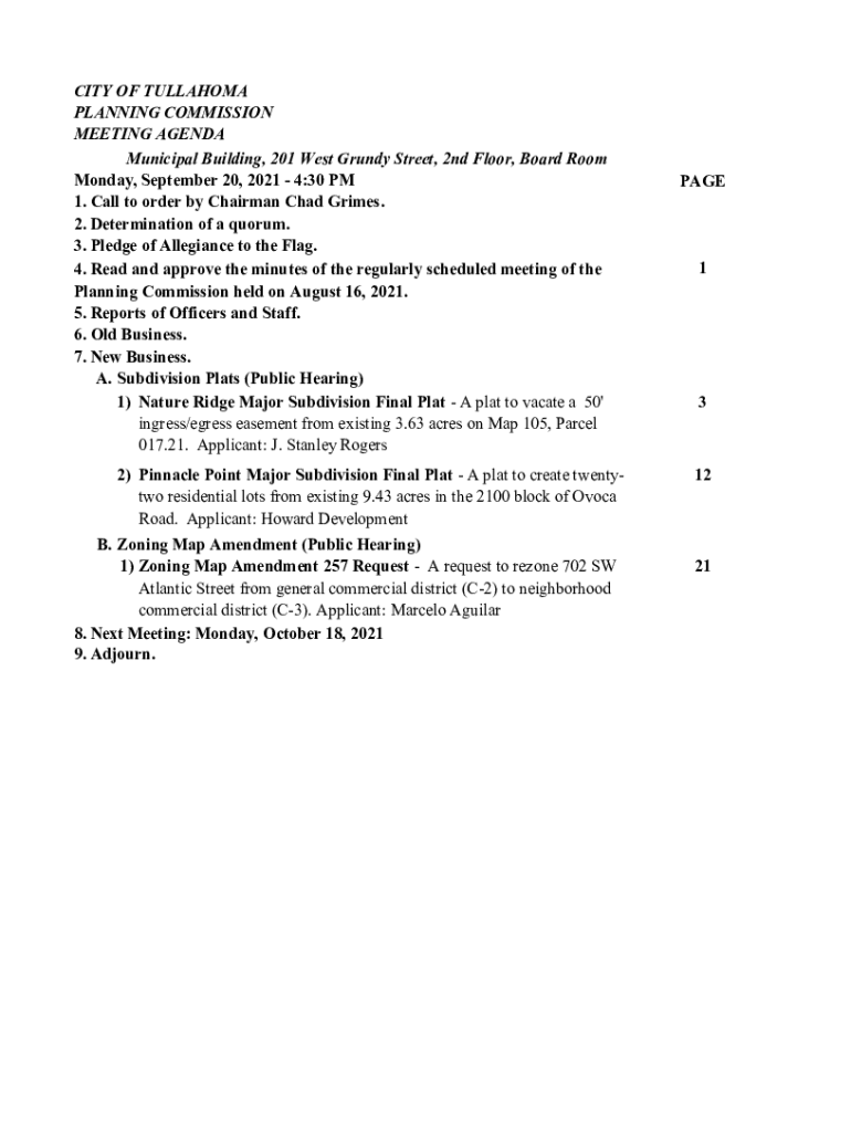 CITY OF OKLAHOMA PLANNING COMMISSION MEETING AGENDA Municipal Building, 201 West Grundy Street, 2nd Floor, Board Room Monday, September 20, 2021 4:30 PM 1. Call to order by Chairman Chad Grimes. 2.