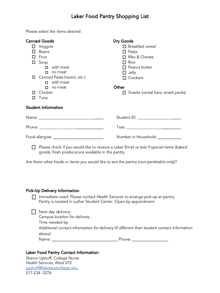 filliolaker-food-pantry-shopping-listfill - laker food is a form used to list the items needed for the food pantry at Laker Food.