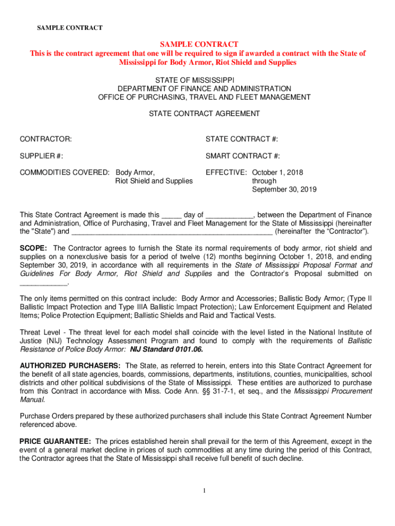 This is the contract agreement that one will be required to sign if awarded a contract with the State of