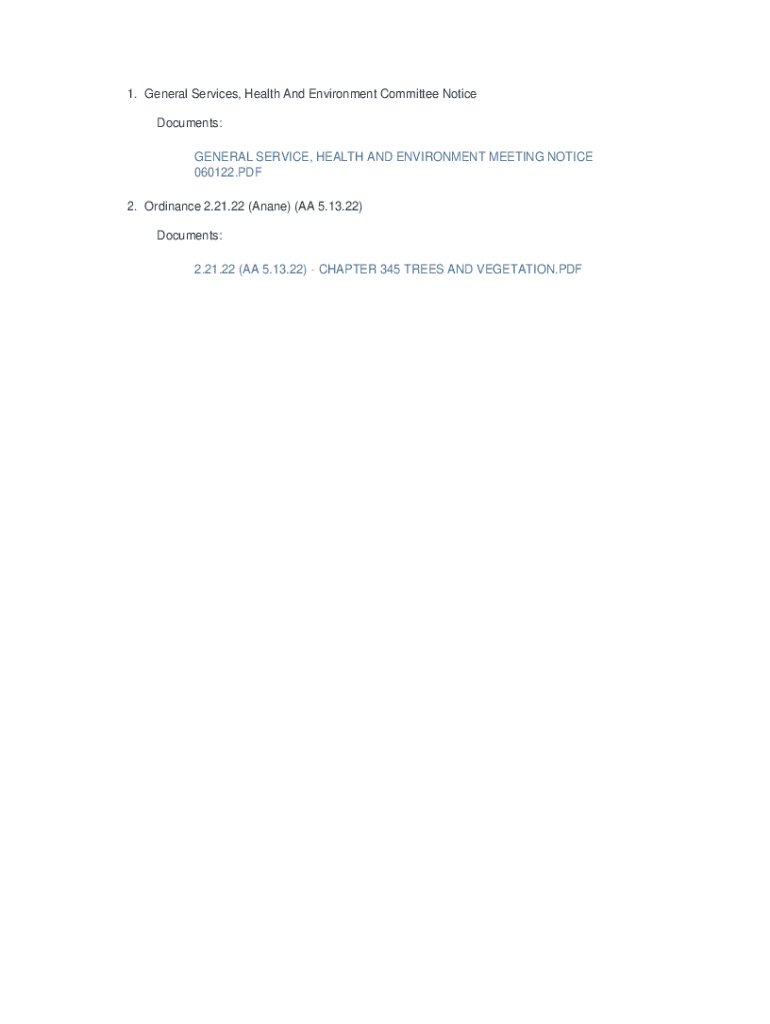 1. General Services, Health And Environment Committee Notice Documents: GENERAL SERVICE, HEALTH AND ENVIRONMENT MEETING NOTICE 060122.PDF 2. Ordinance 2.21.22 (Anne) (AA 5.13.22) Documents: 2.21.22