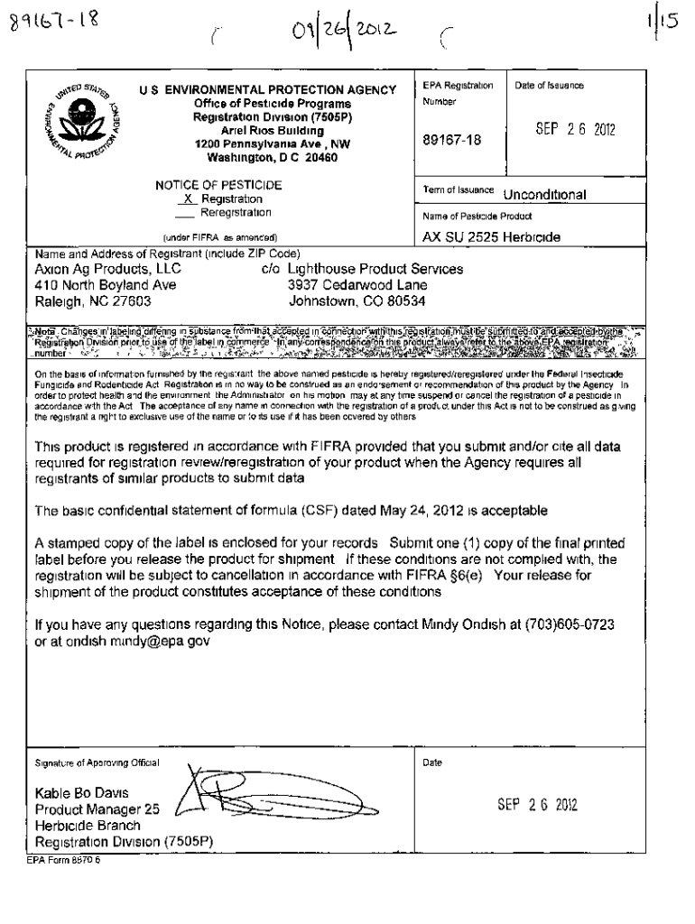 (5U S ENVIRONMENTAL PROTECTION AGENCY Office of Pesticide Programs Registration Division (7505P) Ariel Rios Building 1200 Pennsylvania Ave, NW Washington, D C 20460 NOTICE OF PESTICIDE X Registration