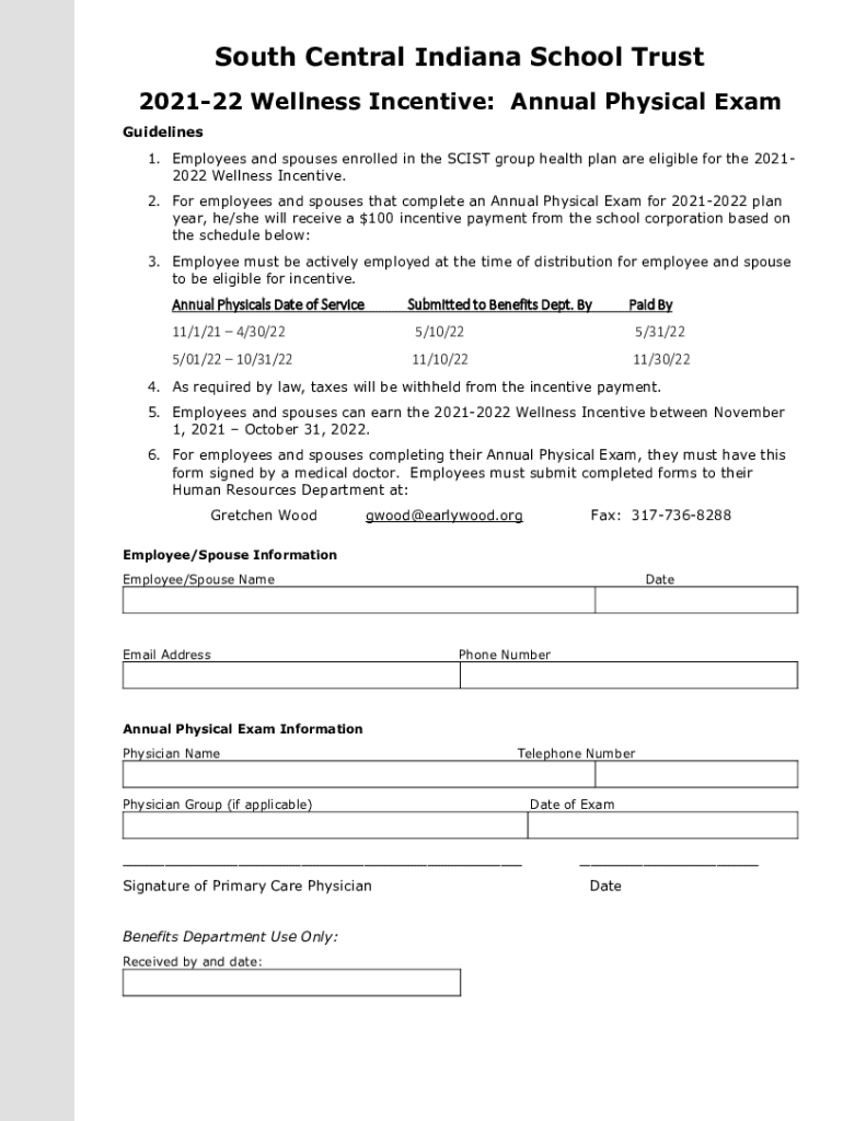 South Central Indiana School Trust 202122 Wellness Incentive: Annual Physical Exam Guidelines 1. Employees and spouses enrolled in the SCHIST group health plan are eligible for the 20212022 Wellness