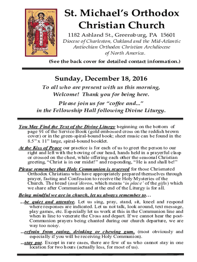 St. Michael's Orthodox Christian Church 1182 Ashland St., Greensburg, PA 15601 Diocese of Charleston, Oakland and the mid-Atlantic Antioch Orthodox Christian Archdiocese of North America. (See the