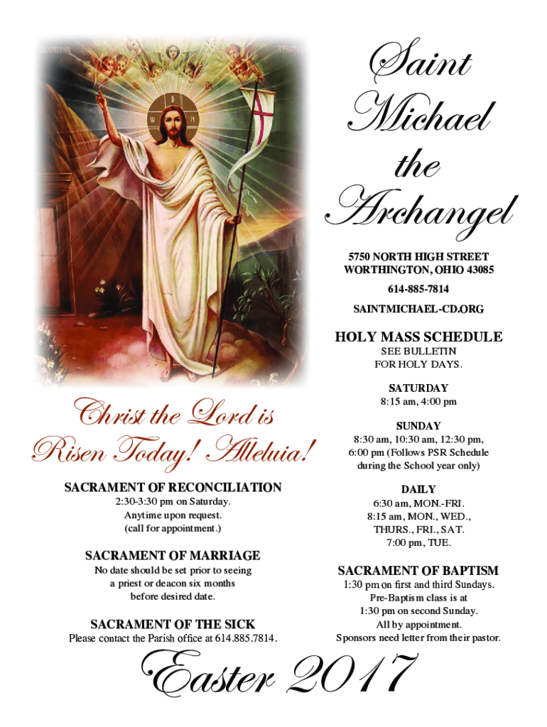 Saint Michael the Archangel 5750 NORTH HIGH STREET WORTHINGTON, OHIO 43085 6148857814 SAINTMICHAELCD.HIGHLY MASS SCHEDULE SEE BULLETIN FOR HOLY DAYS. Christ the Lord is Risen Today! Alleluia! SACRAMENT