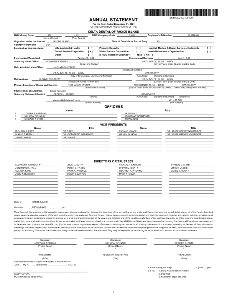 55301202120100100ANNUAL STATEMENT For the Year Ended December 31, 2021, OF THE CONDITION AND AFFAIRS OF DELTA DENTAL OF RHODE ISLAND NAIL Group Code1571 (Current Period)Organized under the Laws of