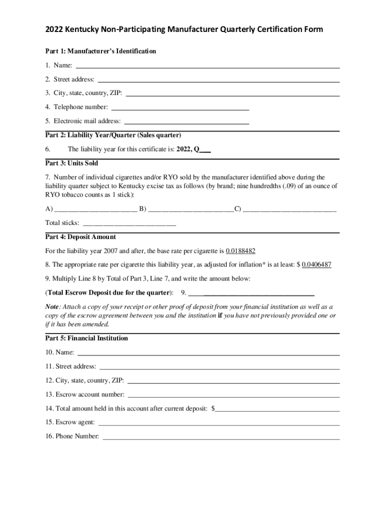 2022 Kentucky Nonparticipating Manufacturer Quarterly Certification Form Part 1: Manufacturers Identification 1. Name: 2. Street address: 3. City, state, country, ZIP: 4. Telephone number: 5. Electronic