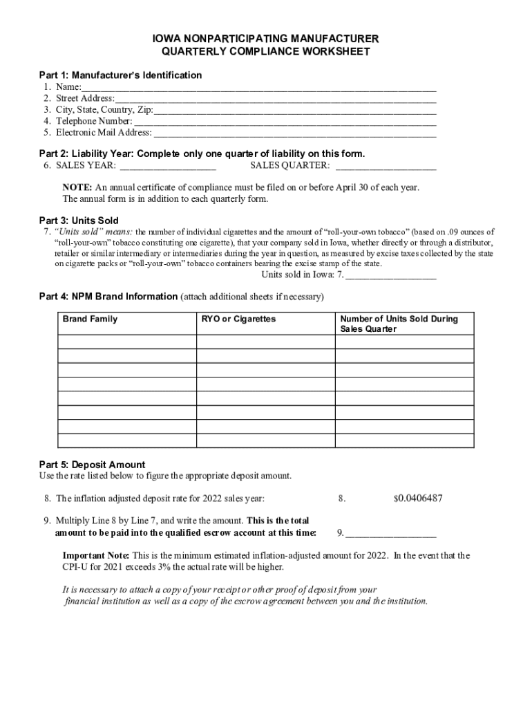 IOWA NONPARTICIPATING MANUFACTURER QUARTERLY COMPLIANCE WORKSHEET Part 1: Manufacturers Identification 1. Name: ___ 2. Street Address: ___ 3. City, State, Country, Zip:___ 4. Telephone Number: ___