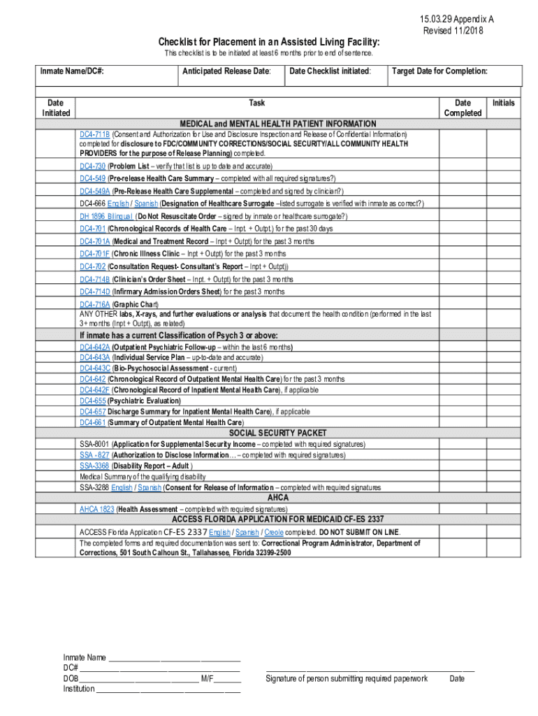 15.03.29 Appendix A Revised 11/2018Checklist for Placement in an Assisted Living Facility: This checklist is to be initiated at least 6 months prior to end of sentence. Inmate Name/DC#:Anticipated