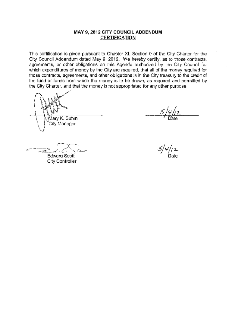 MAY 9,2012, CITY COUNCIL ADDENDUM Certifications certification is given pursuant to Chapter XI, Section 9 of the City Charter for the City Council Addendum dated May 9, 2012. We hereby certify, as