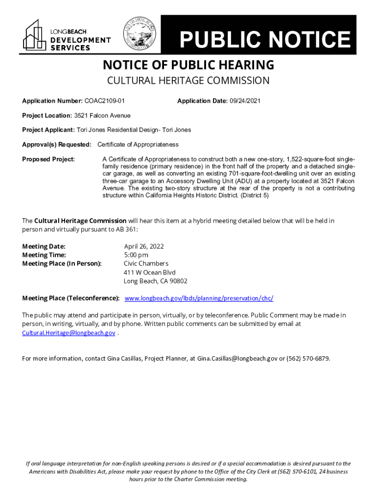 PUBLIC NOTICE OF PUBLIC HEARING CULTURAL HERITAGE COMMISSION Application Number: COAC210901Application Date: 09/24/2021Project Location: 3521 Falcon Avenue Project Applicant: Tori Jones Residential
