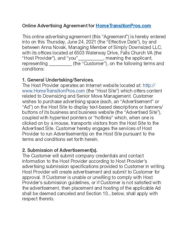 Online Advertising Agreement for HomeTransitionPros. This online advertising agreement (this Agreement) is hereby entered into on this Thursday, June 24, 2021 (the Elective Date), by and between Anna