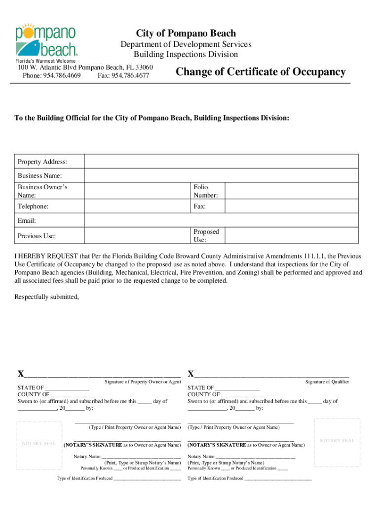City of Pompano Beach Department of Development Services Building Inspections Division 100 W. Atlantic Blvd Pompano Beach, FL 33060 Phone: 954.786.4669 Fax: 954.786.4677Change of Use ChecklistWHEN