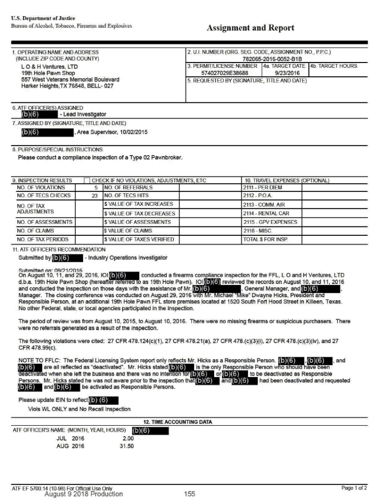 U.S. Department of Justice Bureau of Alcohol. Tobacco. Firearms and ExplosivesAssignment and Report 2. U. I NUMBER (ORG. SEG. CODE, ASSIGNMENT NO., P.P.C.) 78206520160052B1B 3. PERMIT/LICENSE NUMBER