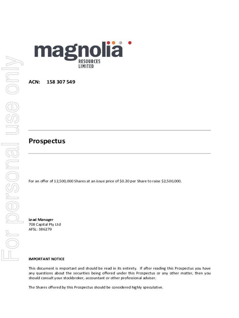 For personal use only ACN: 158307549 Prospectus Foranofferof12,500,000Sharesatanissuepriceof$0.20perSharetoraise$2,500,000. Headbanger 708CapitalPtyLtd ADSL:386279 IMPORTANTNOTICE Thisdocumentisimportantandshouldbereadinitsentirety.