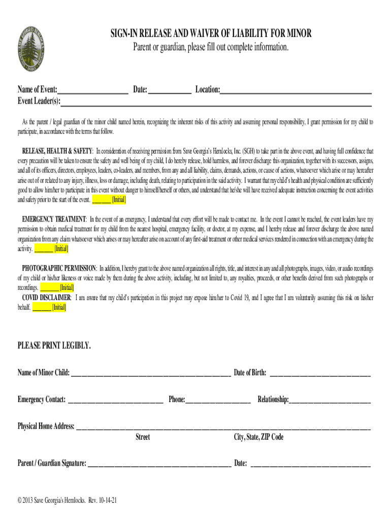 SIGNING RELEASE AND WAIVER OF LIABILITY FOR MINOR Parent or guardian, please fill out complete information. Name of Event: Event Leader(s):Date:Location:As the parent / legal guardian of the minor