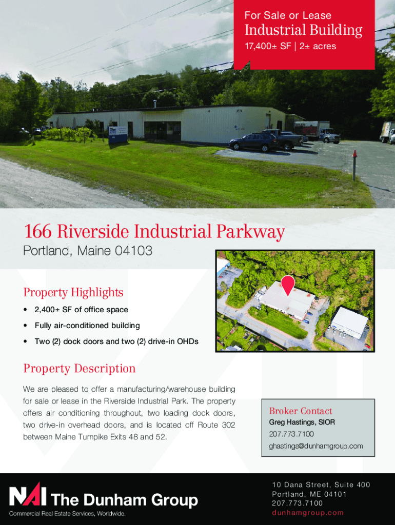 For Sale or LeaseIndustrial Building 17,400 SF | 2 acres166 Riverside Industrial Parkway Portland, Maine 04103 Property Highlights 2,400 SF of office space Fully reconditioned building Two (2) dock