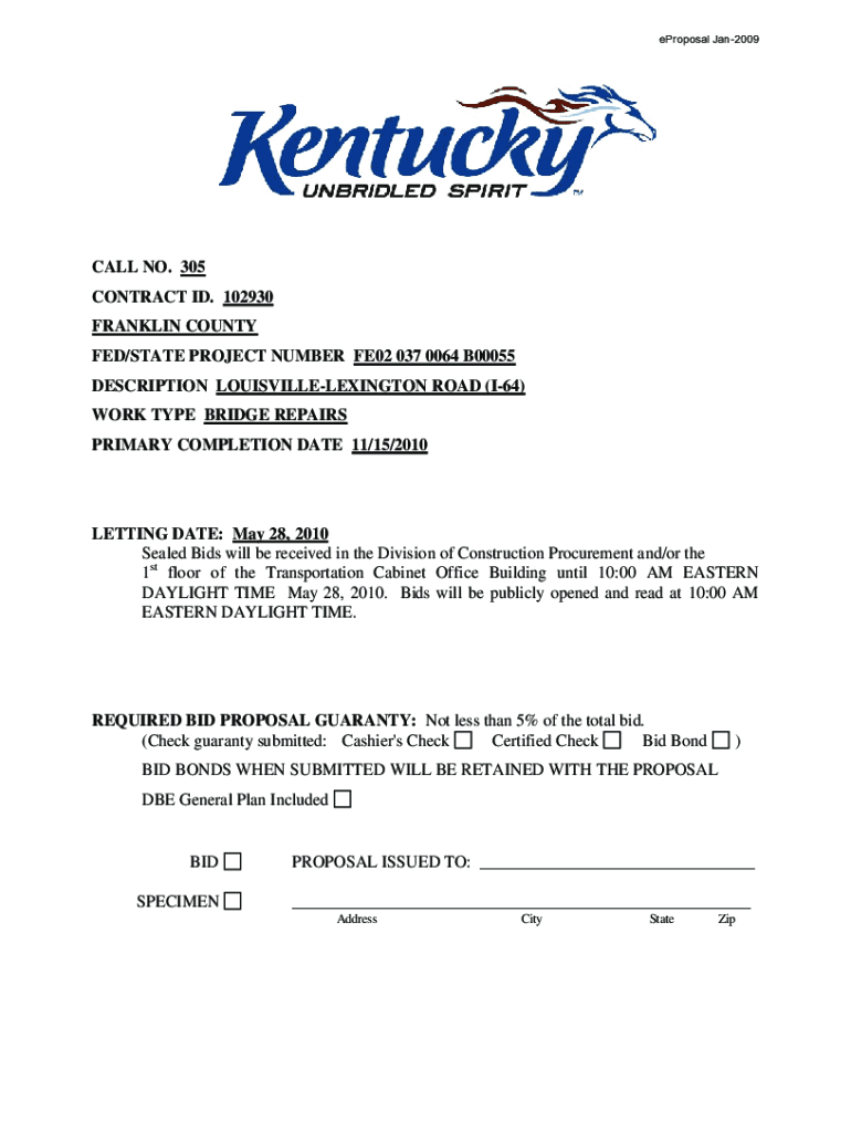 Proposal Jan2009CALL NO. 305 CONTRACT ID. 102930 FRANKLIN COUNTY FED/STATE PROJECT NUMBER FE02 037 0064 B00055 DESCRIPTION LOUISVILLELEXINGTON ROAD (I64) WORK TYPE BRIDGE REPAIRS PRIMARY COMPLETION