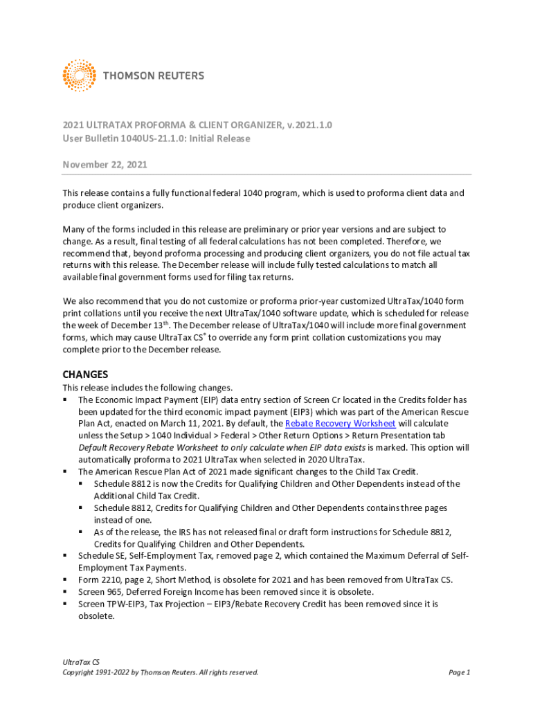 2021 ULTRAPAR PROFORMA & CLIENT ORGANIZER, v.2021.1.0 User Bulletin 1040US21.1.0: Initial Release November 22, 2021, This release contains a fully functional federal 1040 programs, which is used to