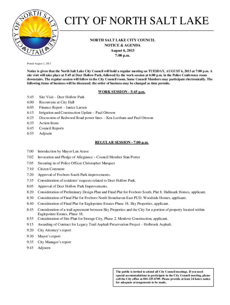 CITY OF NORTH SALT LAKE NORTH SALT LAKE CITY COUNCIL NOTICE & AGENDA August 6, 2013 7:00 p.m. Posted August 1, 2013Notice is given that the North Salt Lake City Council will hold a regular meeting