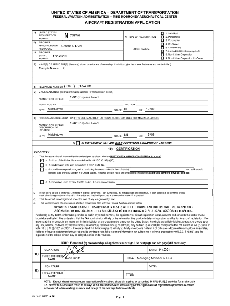 UNITED STATES OF AMERICA DEPARTMENT OF TRANSPORTATION FEDERAL AVIATION ADMINISTRATION MIKE MONROE AERONAUTICAL CENTERAIRCRAFT REGISTRATION APPLICATION 1)2)3)5)UNITED STATES REGISTRATION NUMBER AIRCRAFT