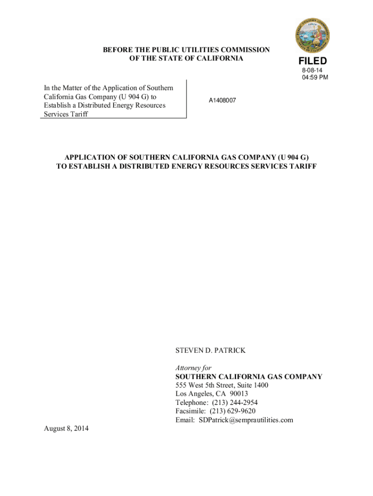 BEFORE THE PUBLIC UTILITIES COMMISSION OF THE STATE OF CALIFORNIAFILED 80814 04:59 Pain the Matter of the Application of Southern California Gas Company (U 904 G) to Establish a Distributed Energy