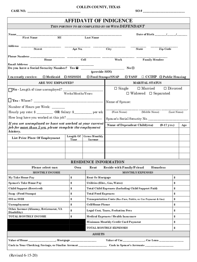 COLLIN COUNTY, TEXAS CASE NO. ___SO # ___AFFIDAVIT OF INDIGENCE THIS PORTION TO BE COMPLETED BY OR WITH DEFENDANT Name___ First Name MI Last Name Address ___ Street___ Apt No. Date of Birth ___/___/______