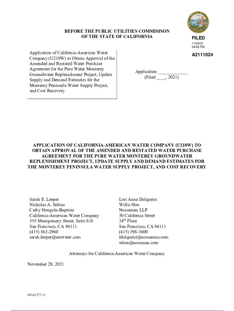 BEFORE THE PUBLIC UTILITIES COMMISSION OF THE STATE OF CALIFORNIAFILED 11/29/21 04:59 Application of California American Water Company (U210W) to Obtain Approval of the Amended and Restated Water