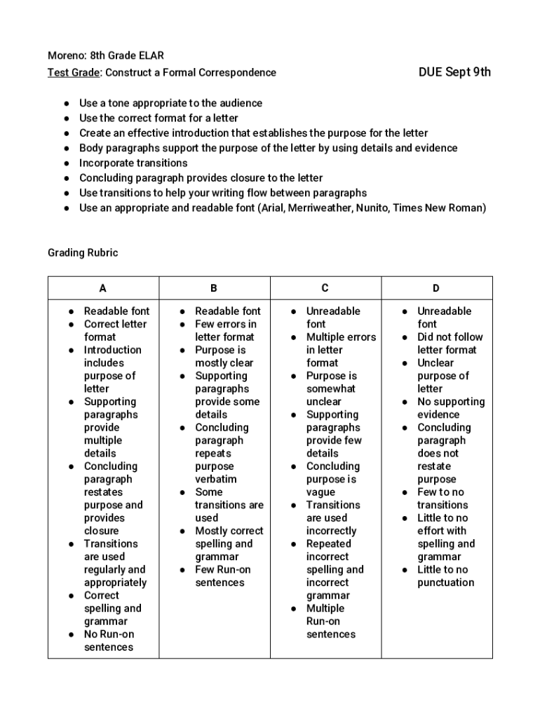 Moreno: 8th Grade EAR Test Grade: Construct a Formal Correspondence D UE Sept 9th Use a tone appropriate to the audience Use the correct format for a letter Create an effective introduction that establishes