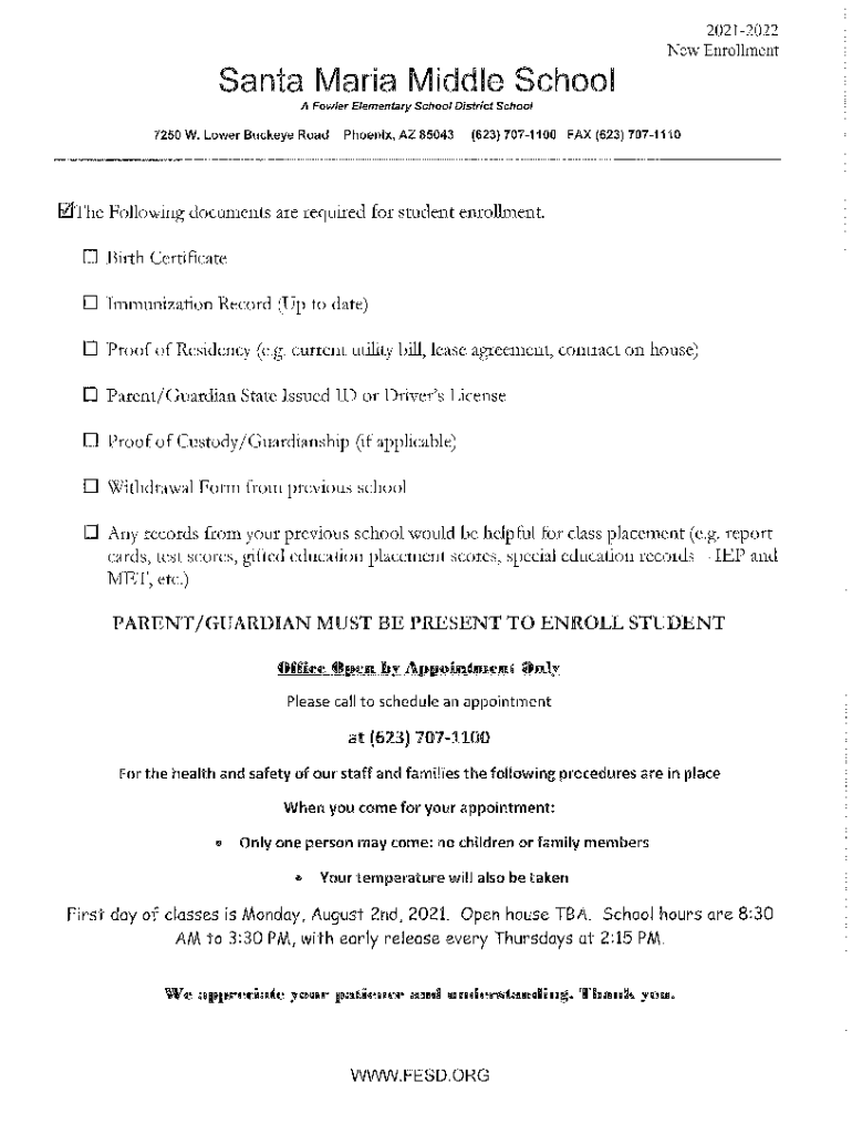 20212022 New EmollmentSanta Maria Middle School A Fowler Elementary School District School7250 W. Lower Buckeye Road Phoenix, AZ 85043(623) 7071100 FAX (623) 7071110@The Following documents are required