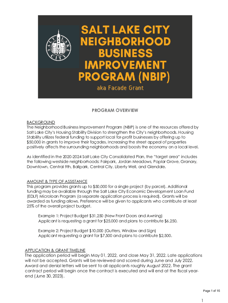 PROGRAM OVERVIEW BACKGROUND The Neighborhood Business Improvement Program (NIP) is one of the resources offered by Salt Lake Cities Housing Stability Division to strengthen the Cities neighborhoods.