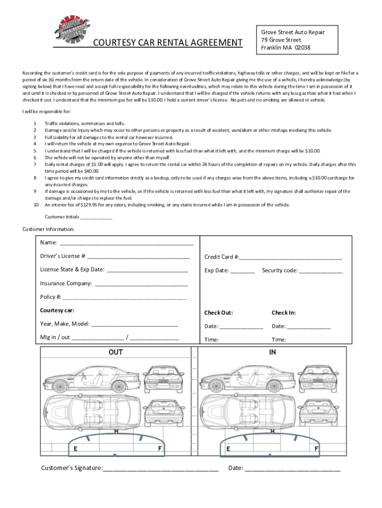 COURTESY CAR RENTAL AGREEMENTGrove Street Auto Repair 79 Grove Street Franklin MA 02038Recording the customers credit card is for the sole purpose of payments of any incurred traffic violations, highway