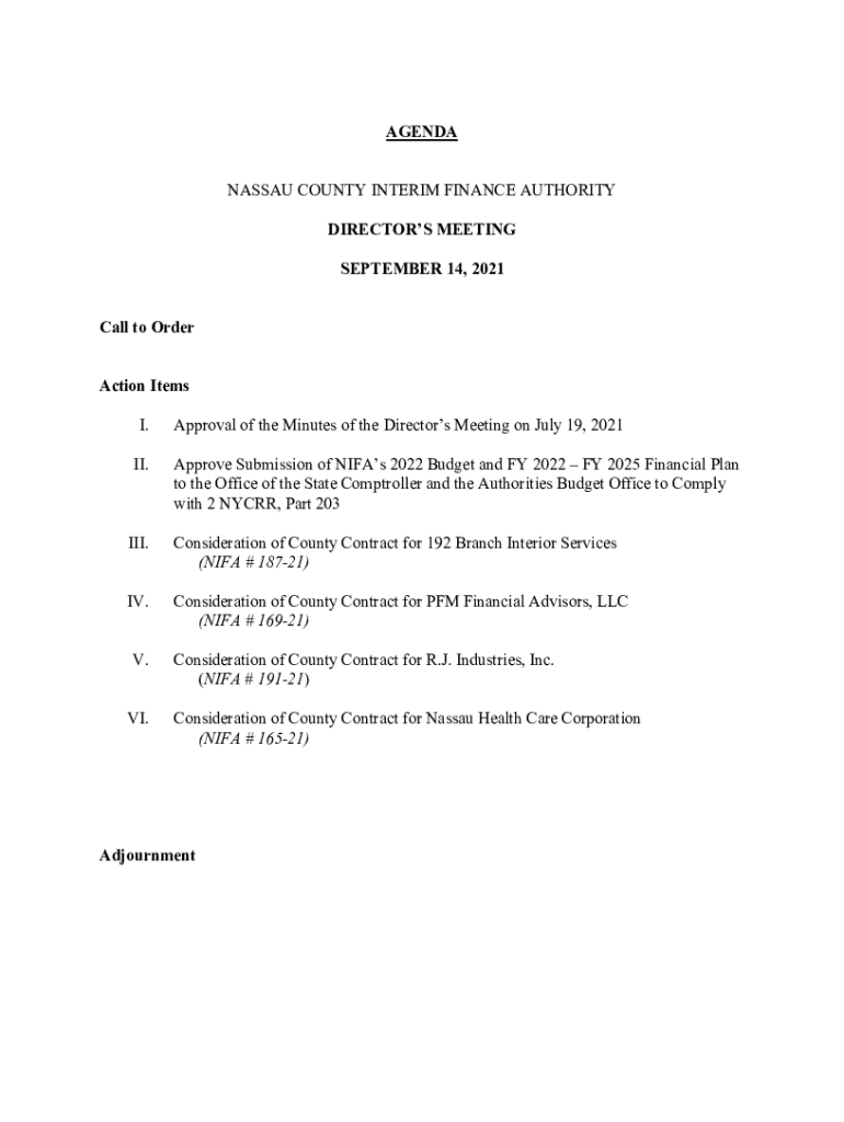 AGENDA NASSAU COUNTY INTERIM FINANCE AUTHORITY DIRECTORS MEETING SEPTEMBER 14, 2021, Call to Order Action Items I. II. Approval of the Minutes of the Directors Meeting on July 19, 2021, Approve Submission