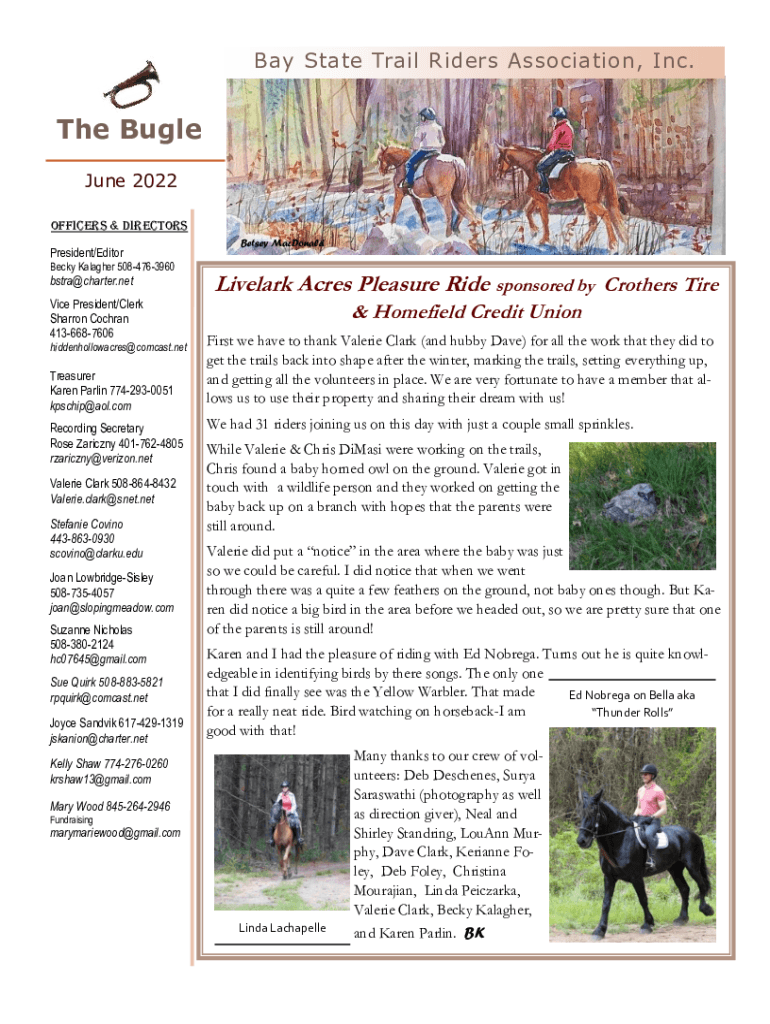 Bay State Trail Riders Association, Inc. The Bugle June 2022 Officers & Directors President/Editor Becky Gallagher 5084763960bstra@charter.netVice President/Clerk Sharron Cochran 4136687606 hiddenhollowacres@comcast.netTreasurer