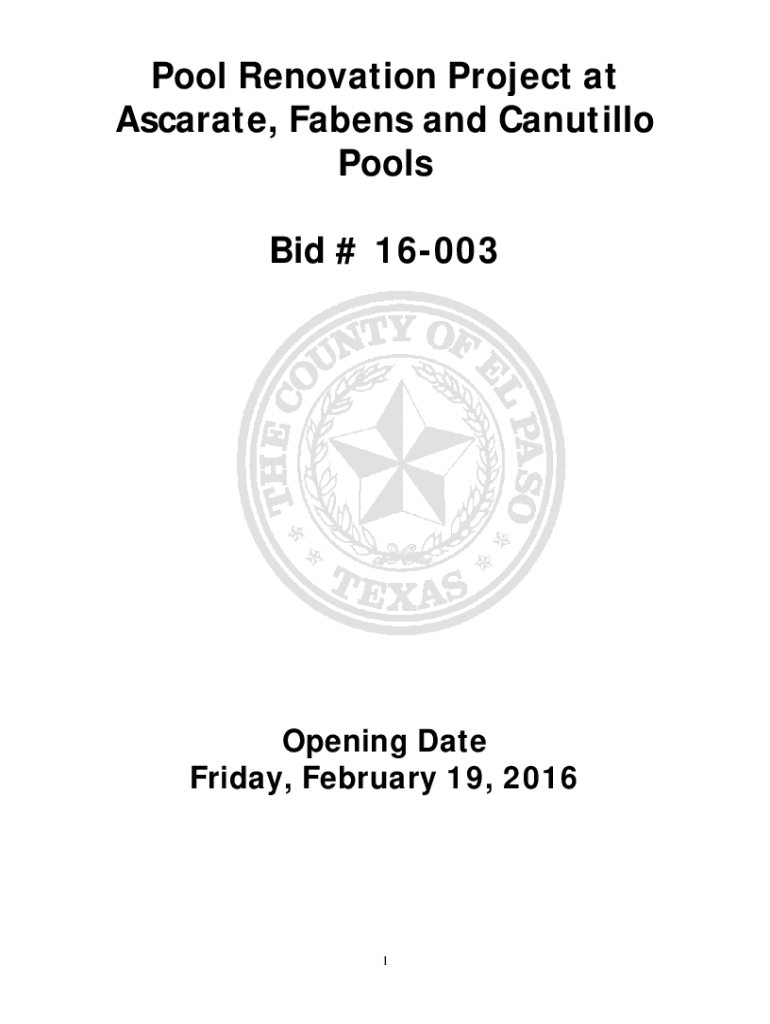 Pool Renovation Project at Accurate, Fab ens and Castillo Pools Bid # 16003Opening Date Friday, February 19, 20161El Pass County Code of Ethics Training Affidavit (This form must be signed by an officer,