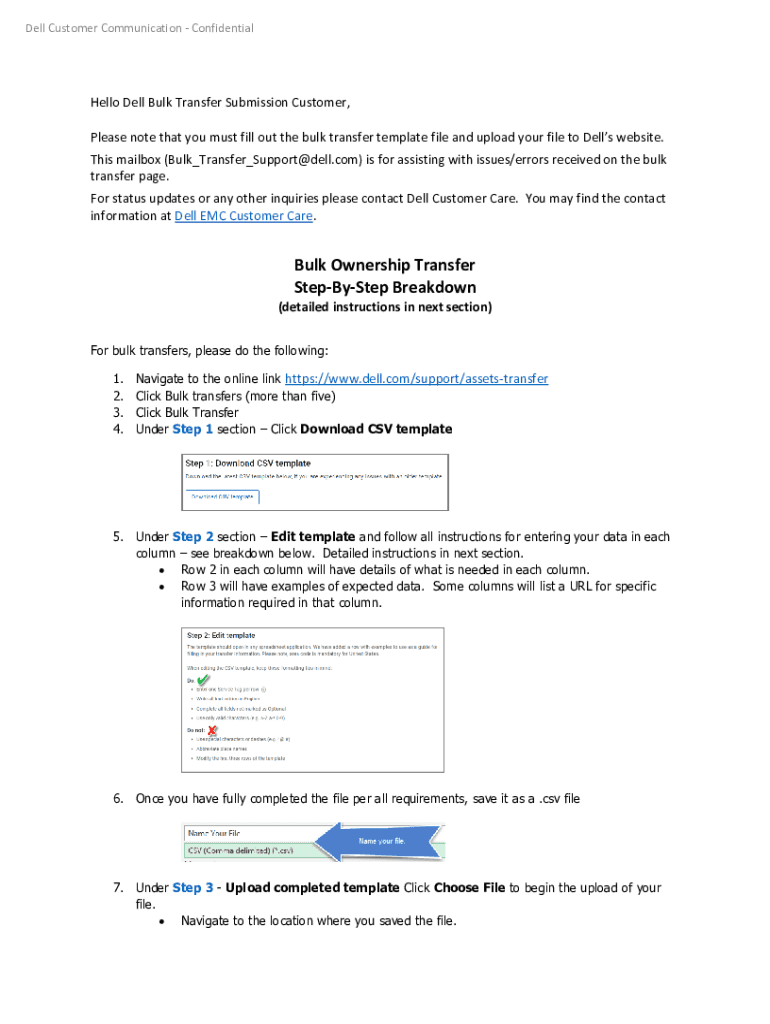 Dell Customer Communication ConfidentialHello Dell Bulk Transfer Submission Customer, Please note that you must fill out the bulk transfer template file and upload your file to Dells website. This