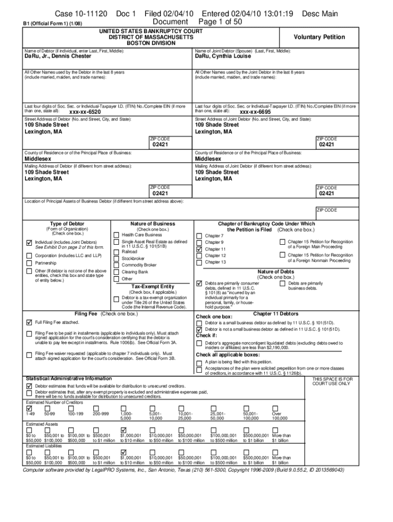 Case 1011120Doc 1B1 (Official Form 1) (1/08)Filed 02/04/10 Entered 02/04/10 13:01:19 Document Page 1 of 50UNITED STATES BANKRUPTCY COURT DISTRICT OF MASSACHUSETTS BOSTON Divisions Main Voluntary Petitionary